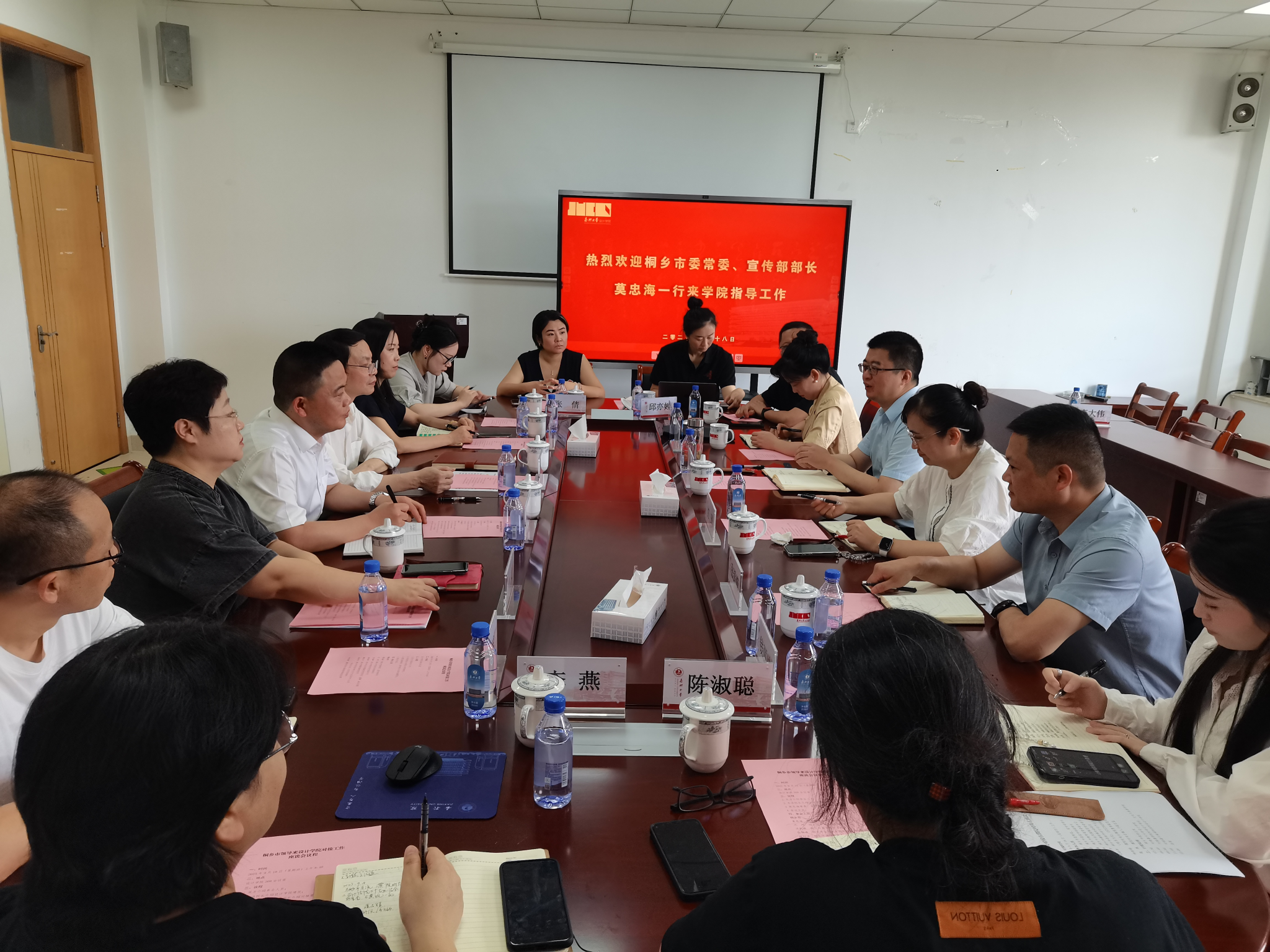 2025年9月18日上午,桐乡市委常委、宣传部部长莫忠海率队莅临ylg060net永利,就濮院时尚古镇校地合作基地建设开展专项对接。桐乡市委宣传部副部长沈琦,市教育局党委副书记沈利敏,金凤凰集团党委委员、董事、副总经理张锡峰,濮院镇党委委员魏衍方,学院党政班子成员及相关专业负责人、系主任等参加座谈研讨。